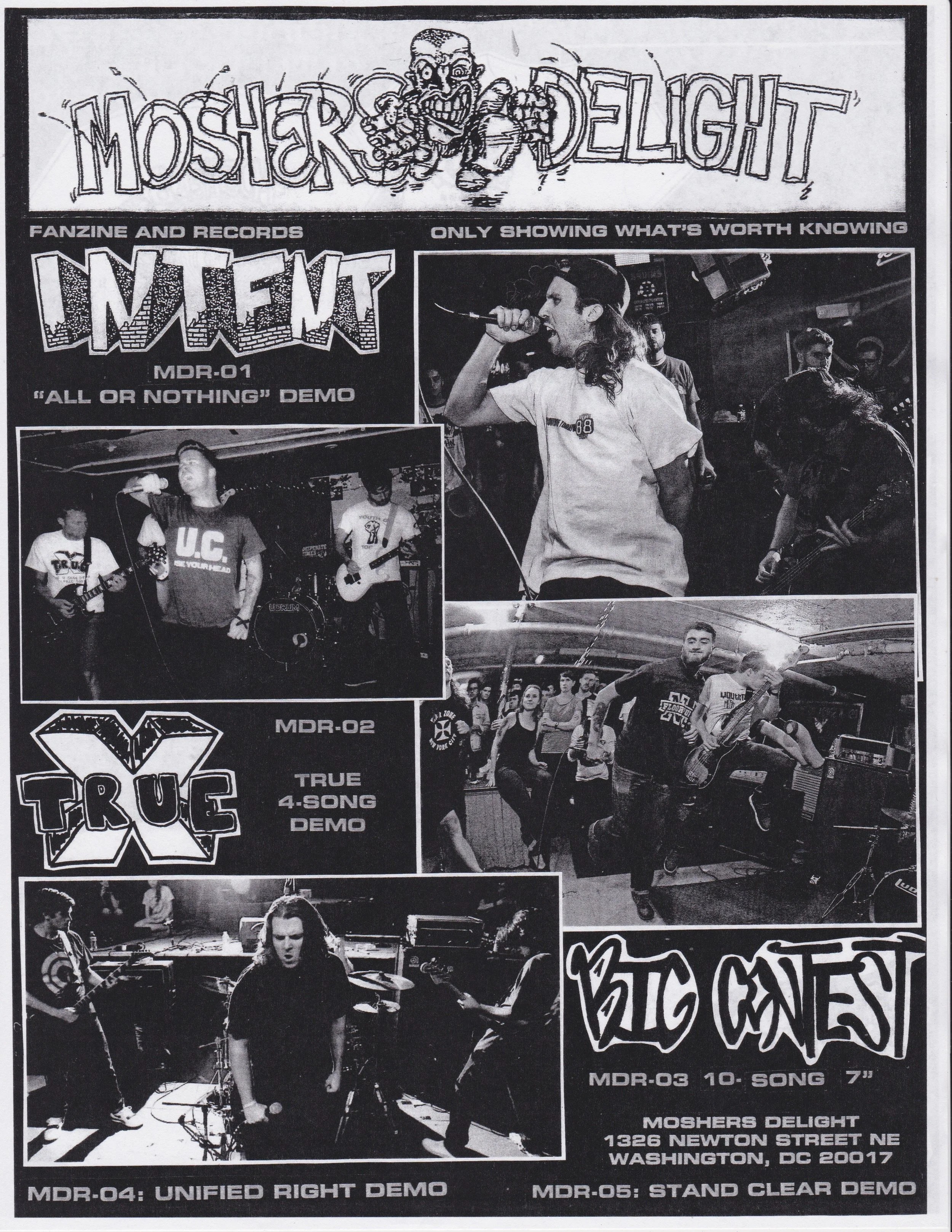 Black and white flyer for Moshers Delight, featuring photos of band members performing. The flyer highlights three demos: 'All or Nothing' by Intent, 'True 4 Song' by Truc, and '10 Song 7"' by Big Contest. It also provides address details for Moshers Delight in Washington, DC.